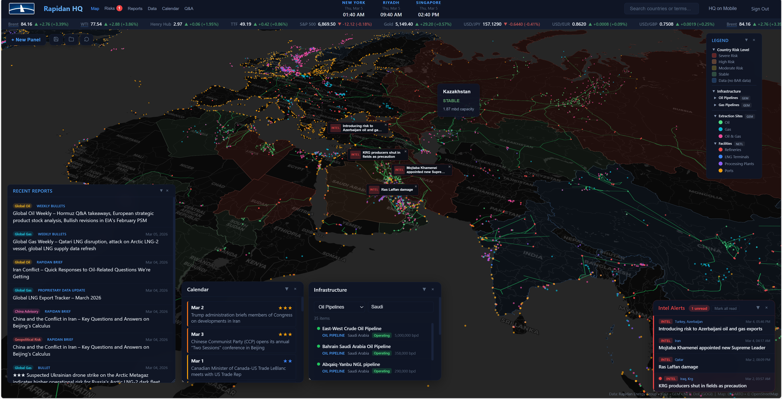 Interactive Geopolitical Risk Map: Explore a fully interactive world map with country-level overviews, intel alerts, and energy infrastructure.