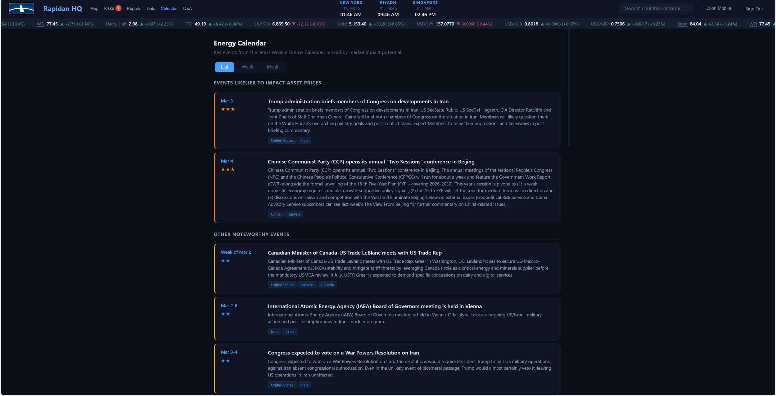 Calendar: Stay ahead of the curve with a built-in calendar of upcoming geopolitical and energy-related events, summits, OPEC meetings, election dates, and policy deadlines.