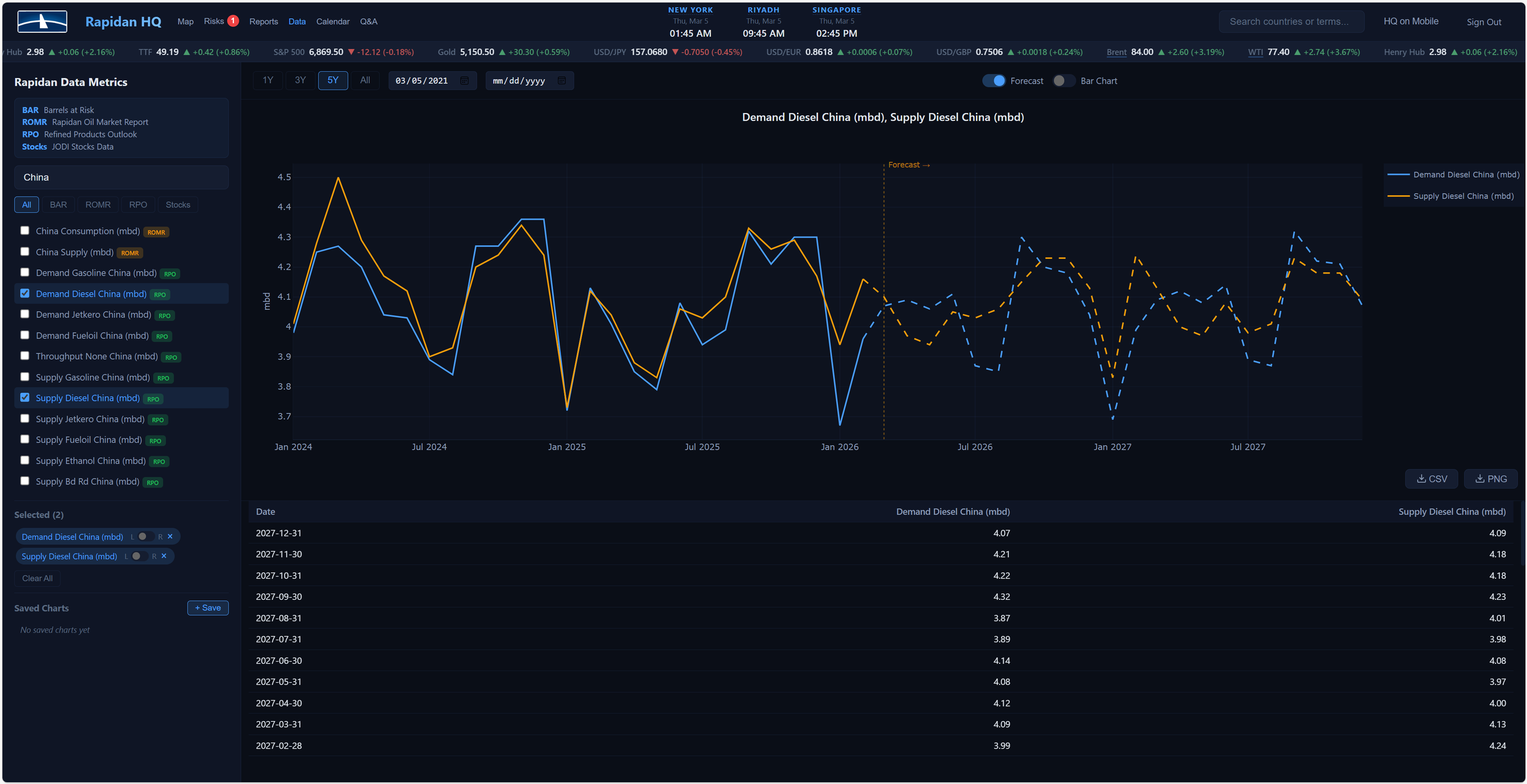 Data Visualization Tool: Build custom, interactive charts from Rapidan’s proprietary energy datasets. Select from hundreds of metrics - crude oil balances, refined product outlooks, country-level production data, stocks data, barrels-at-risk estimates, and price forecasts - and compare them side by side on a single, smooth dashboard.